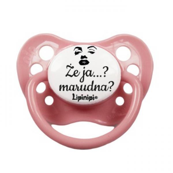 Smoczek dla niemowlaka z napisem Że ja...? Marudna? Pastelowo różowa kolorystyka w sam raz dla córeczki. Dostępne dwa rozmiary smoczków: od 0 do 6 m oraz od 6 do 18 miesięcy.