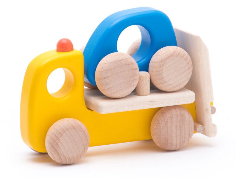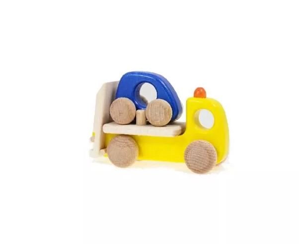 Autko Pomocy drogowej z samochodzikiem dla dzieci od 18 miesięcy. Zabawka imitująca lawetę, solidnie wykonana z naturalnego drewna oraz pomalowana w pełni bezpiecznymi farbami.