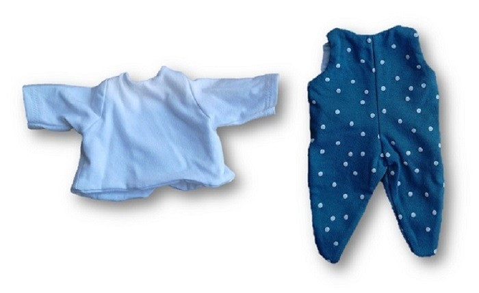 Polecamy komplecik: śpioszki w groszki + kaftanik dla lalki o wysokości 45-48 cm. W kolorystyce biało-niebieskiej. Oba ubranka zapinane są na rzep.