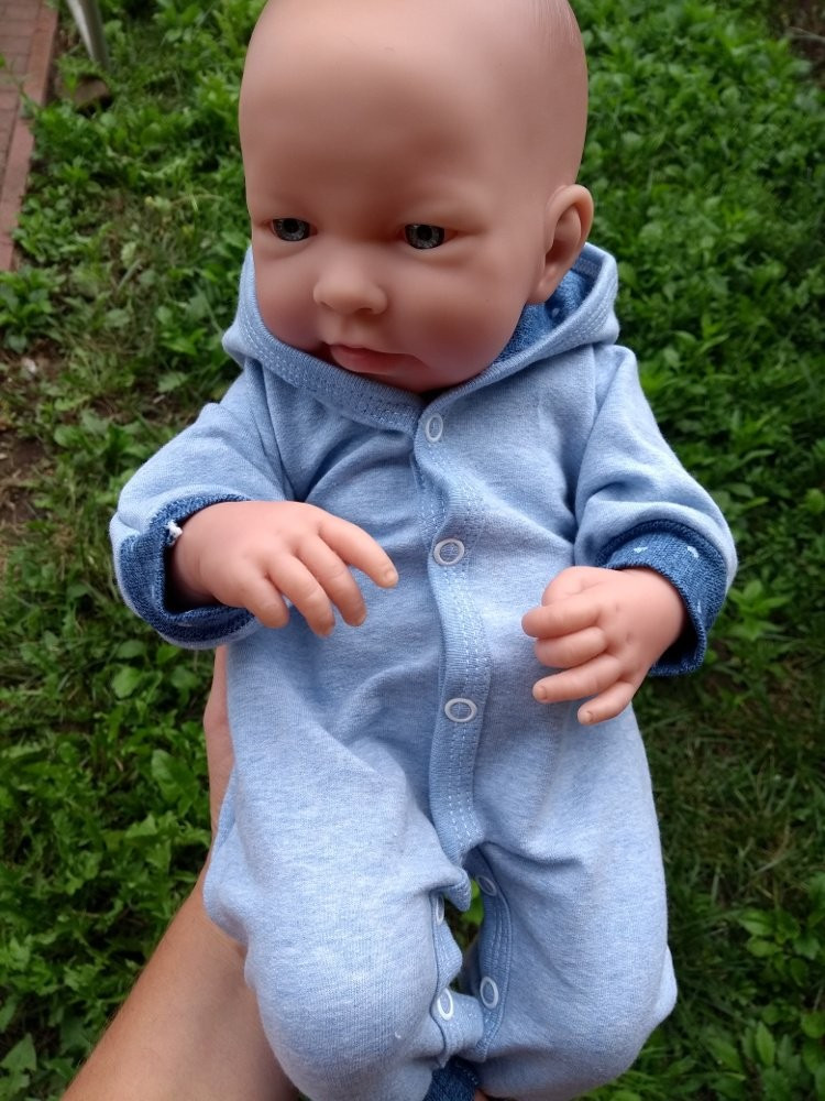 Niebieski pajacyk z kapturkiem, idealny dla lalki bobas o wysokości od 42 do 45cm.