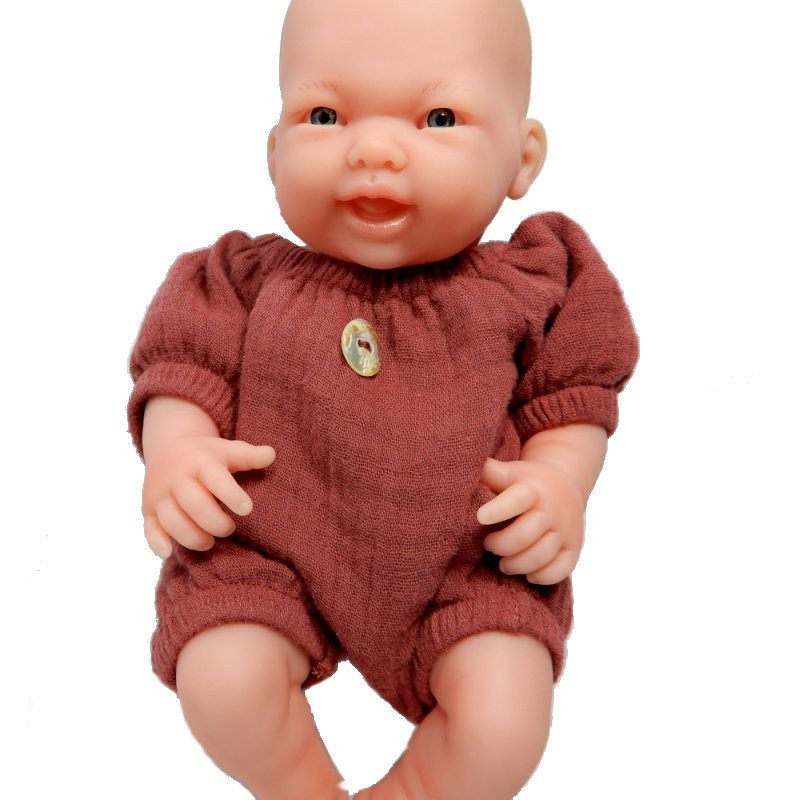 Śliczny "bufiasty" kombinezon dla lalki wykonany z muślinu. Jednoczęściowy, w kolorze wiśniowym.