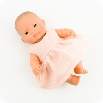 Letnia sukienka z muślinu dla lalki o wysokości około 22-25 cm. Sukienka jest w kolorze pudrowego różu. Bardzo starannie wykonana.