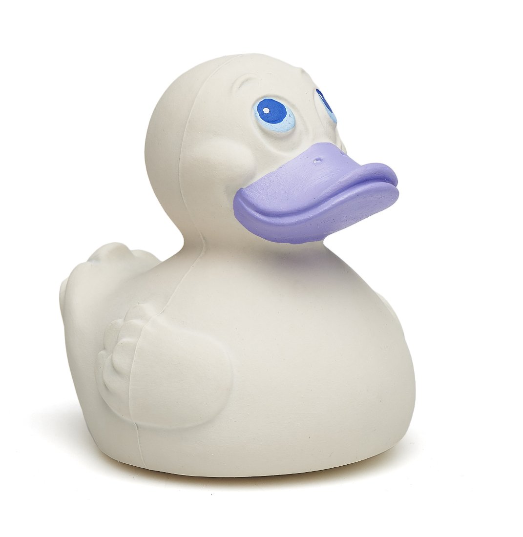 Kaczuszka do kąpieli wykonana z naturalnego kauczuku pochodzącego z drzewa Hevea Brasilensis. Kaczka nie posiada dziurki, dzięki czemu woda nie dostaje się do środka. Kolor: biały z fioletowym dziubkiem.