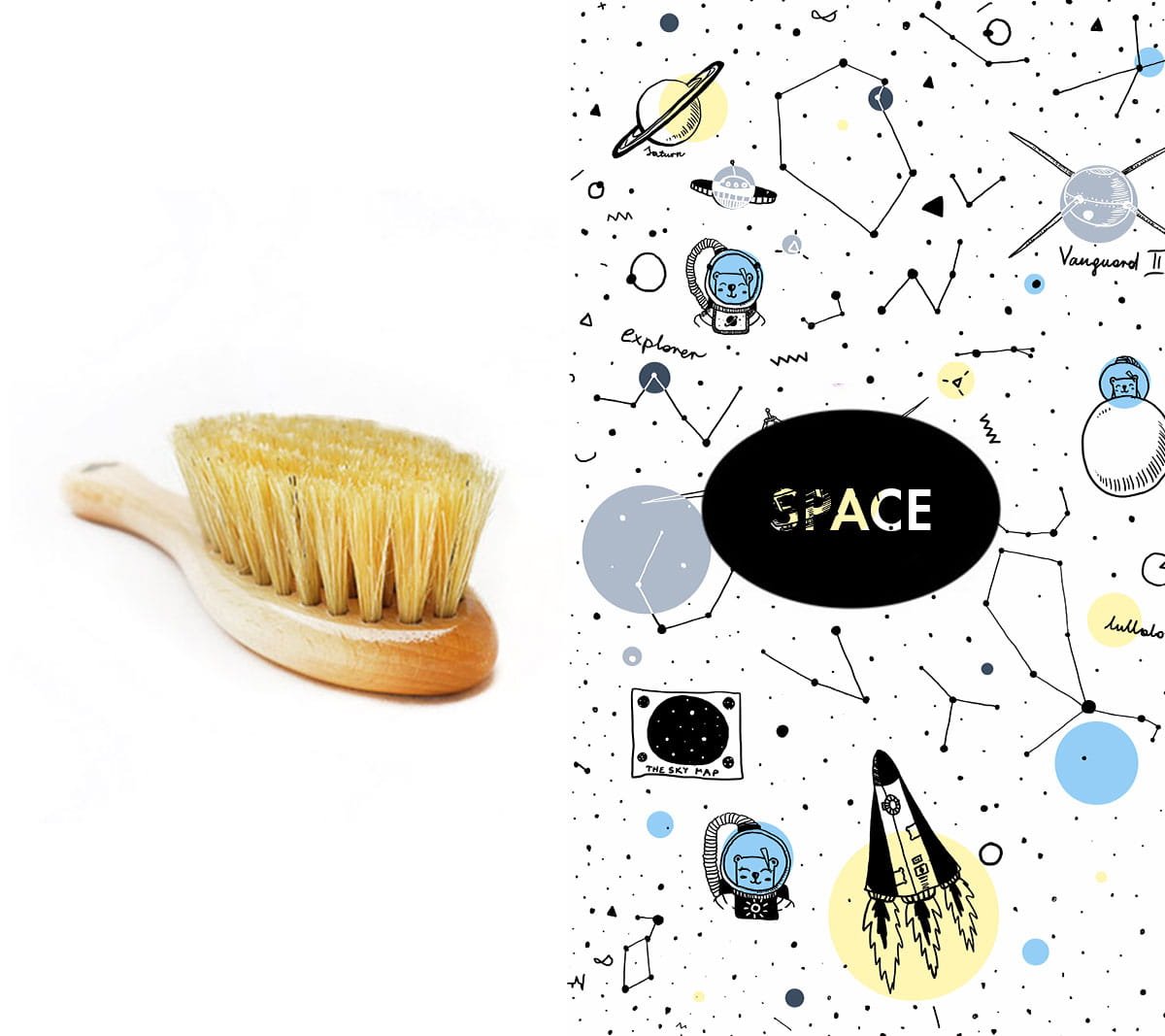 Szczotka dla dzieci i niemowląt z naturalnej szczeciny z drewnianą rączką w zestawie z praktyczną muślinową myjką - dostępne wzory: księżniczka , Mr B, kucharz oraz kraina mlekiem i miłością płynąca.