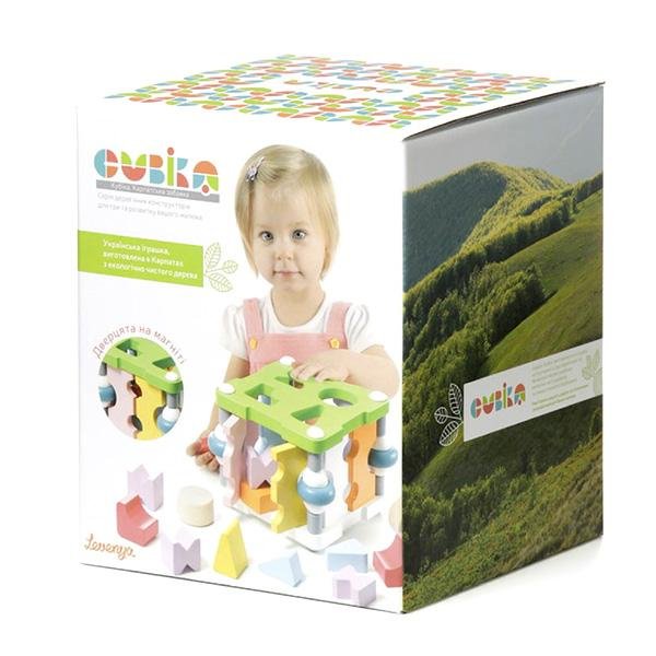 Sorter firmy Cubika w kształcie sześcianu wykonany jest z drewna i pomalowany nietoksycznymi farbami. W zestawie jest 8 drewnianych klocków (różne kształty, rozmiary, kolory), które pasują do określonych otworów.