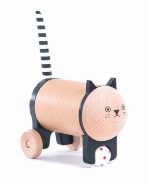 Kotek skrytka do ciągnięcia i chowania różnych skarbów, wykonany z drewna i pomalowany ekologicznymi farbami. Rekomendowany dla dzieci od 18 miesiąca.