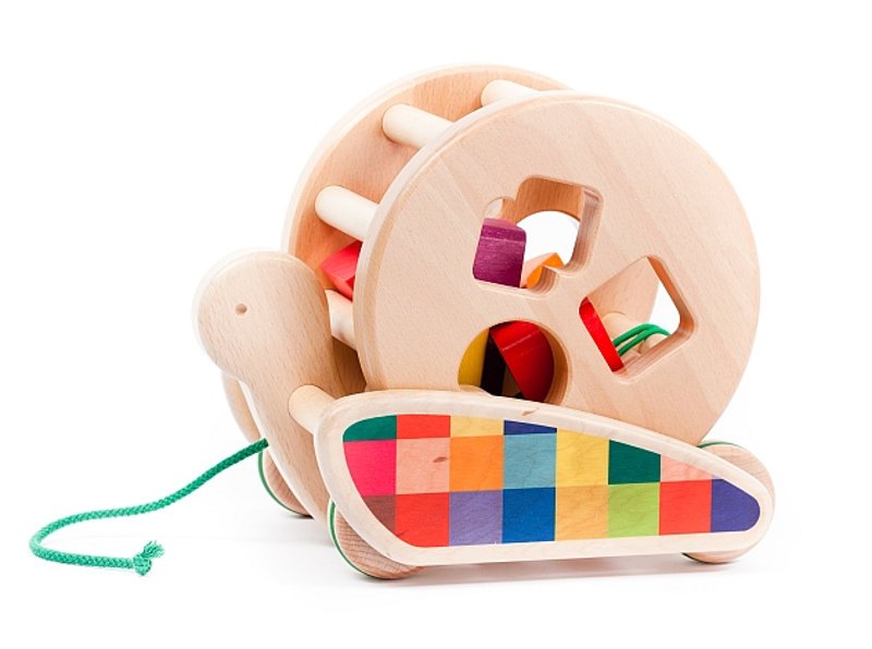 Zabawka drewniana ślimak Sorter dla dzieci od 1,5 roku do ciągnięcia za sznurek. Zabawka łączy w sobie dwie funkcje - zabawki do ciągnięcia oraz sortera do wrzucania klocków, dzięki czemu dzieci uczą się dopasowywać kształty.