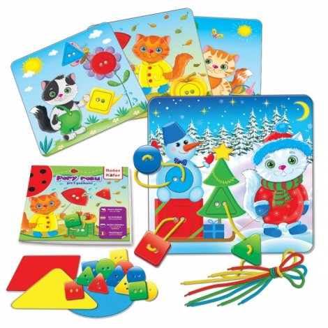 Gra polega na przymocowaniu guzików w danym kolorze w odpowiednim miejscu na planszy za pomocą sznurówki.