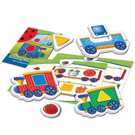 Gra magnetyczna Kolory i figury składa się z 4 lokomotyw (na każdej inna figura geometryczna), do kórych dołączone są po 3 wagniki. Do wagoników dziecko będzie musiało włożyć odpowiedni przedmiot. Następnym zadaniem dziecka będzie przyczepienie odpowiednich magensów na kartach zadań.