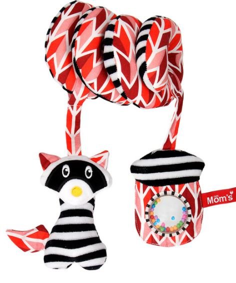 Grzechotka zawieszona na spiralce stymuluje zmysł słuchu, maskotka szopa zachęca dziecko do chwytania.