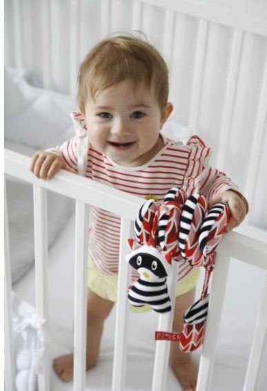 Dzięki spiralnemu kształtowi zawieszkę można z łatwością zamocować na wózeczku lub łóżeczku.