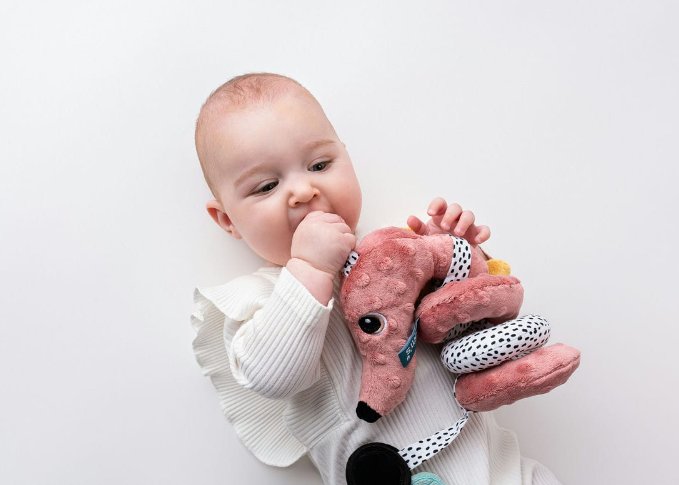 Dzięki spiralnemu kształtowi zawieszkę można z łatwością zamocować na wózeczku lub łóżeczku.