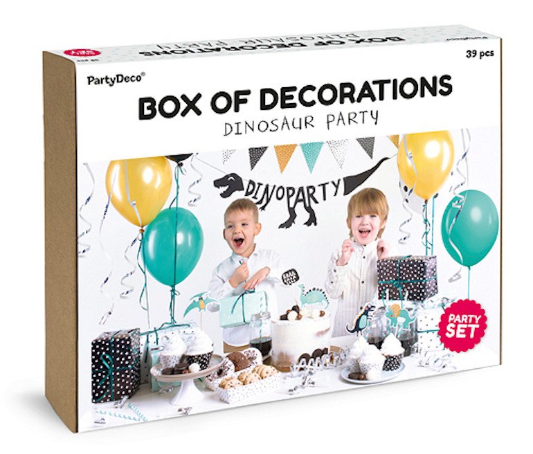 W zestawie znajdują się min. banery, girlanda, słomki, foremki na słodycze, balony, serpentyny, gwizdki, topper na tort czy tasiemki.
